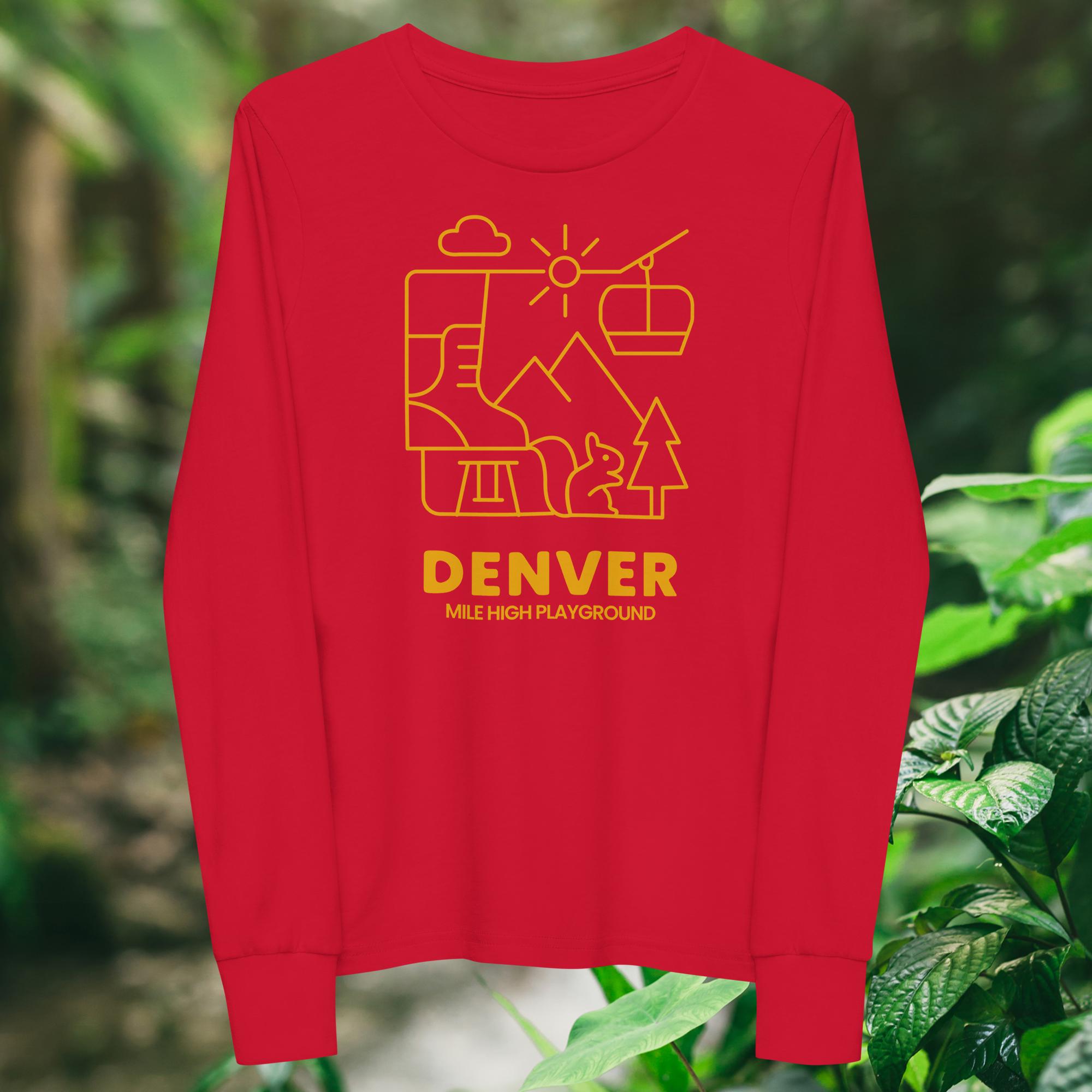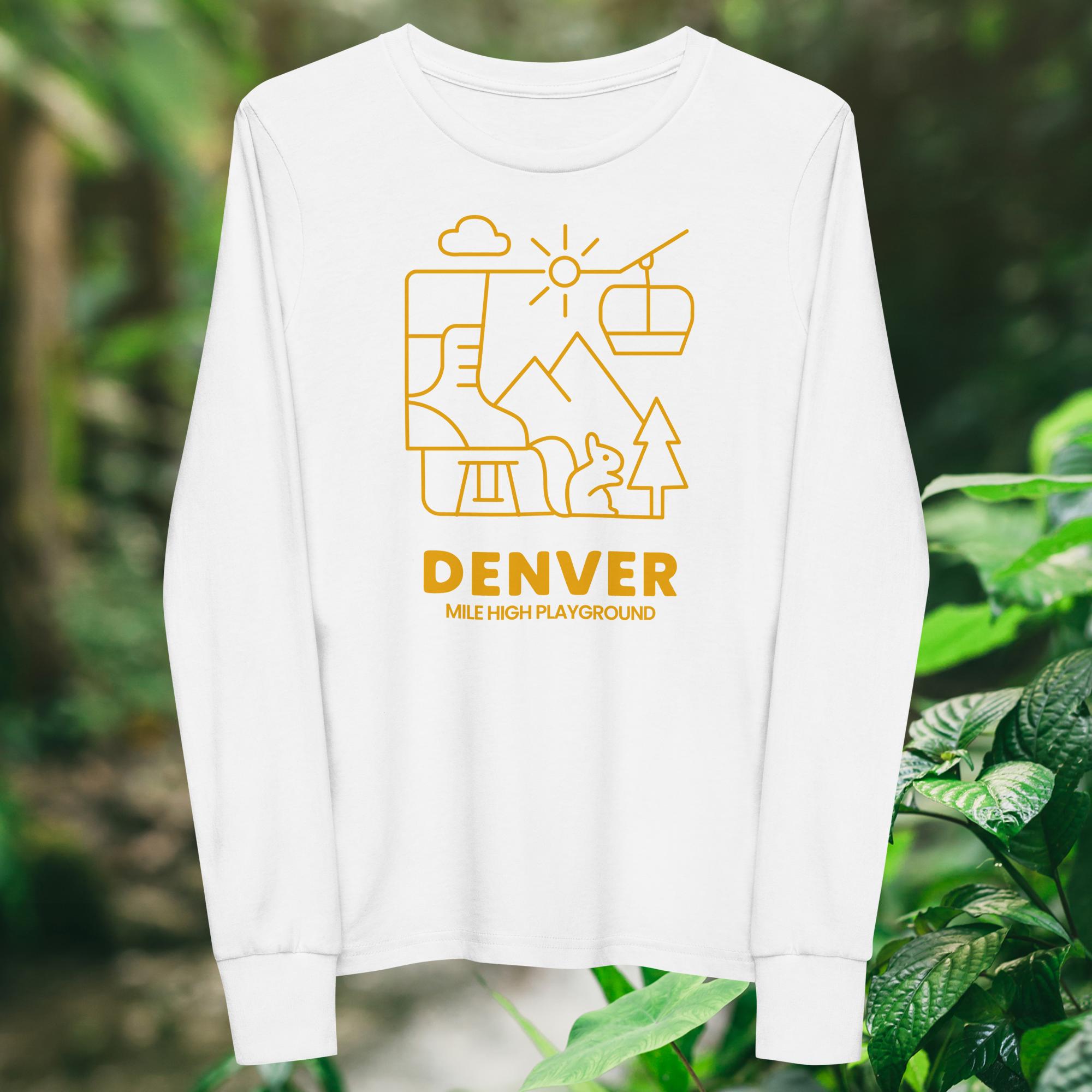 The Mile High Playground graphic captures the energy and imagination of city play. Featuring bold lines and playful shapes, it brings Denver’s urban parks to life. The bright yellow print pops against the classic T-shirt background, giving your child a fun, expressive look that pairs well with any outfit.